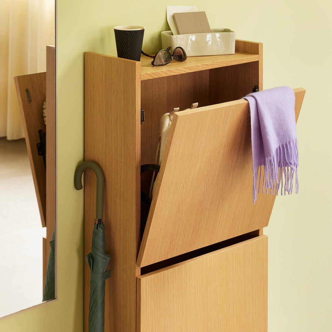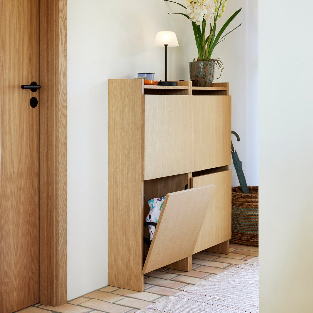 Découvrez un meuble à chaussures en bois certifié FSC alliant élégance et fonctionnalité. Son rangement sur deux niveaux optimise les petits espaces, et il peut être facilement combiné avec une seconde unité pour plus de capacité. Une solution design et minimaliste pour un intérieur organisé et soigné.